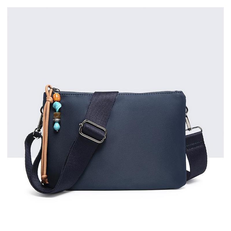 Bandolera en tejido tipo nylon con asa ajustable al tono. Cierre mediante cremallera. Detalle de piedras en el tirador.