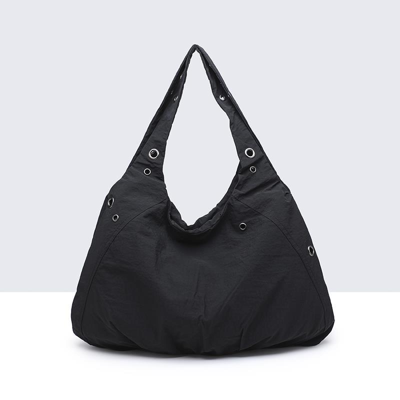 Bolso ultraligero con asa al hombro y detalle de arandelas plateadas. Cierre mediante cremallera. Bolsillo interior y exterior con cremallera.