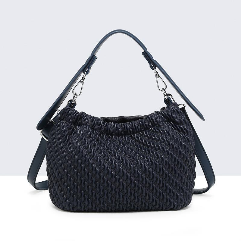 Mini bolso con estructura de arruga en ecopiel. Asa corta y asa larga ajustable, ambas extraíbles. Cierre mediante cremallera. Bolsillo interior y exterior con cremallera.