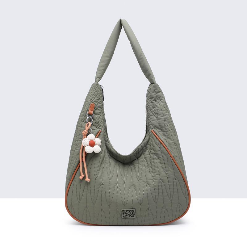 Bolso con dettalle de costuras y asa de hombro. Cierre mediante cremallera. Bolsillo interior y exterior con cremallera. Vivos a contraste. Detalle de colgador de flor.