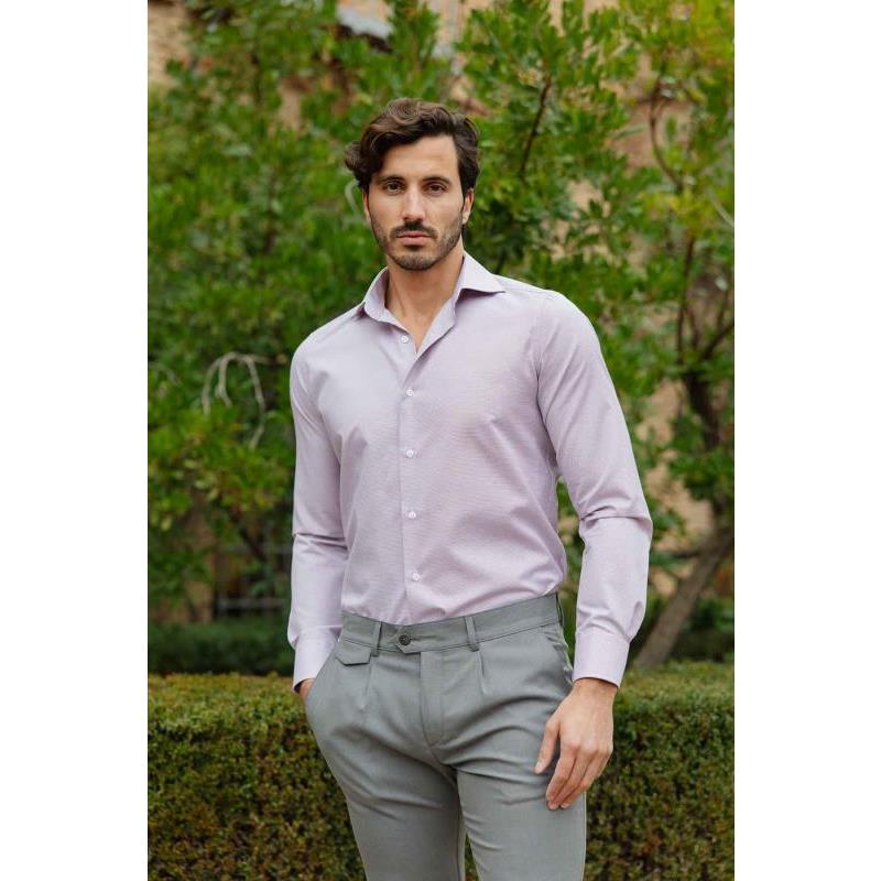 Camisa de vestir con micropuntos en tono rosa-lila. Sin botones en el cuello. Patrón regular.
