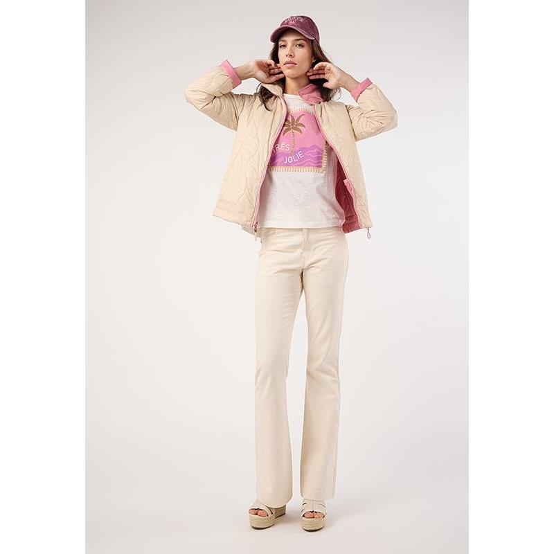 Camiseta en manga corta con tejido rústico tipo flamé. Detalles a contraste en rosa.