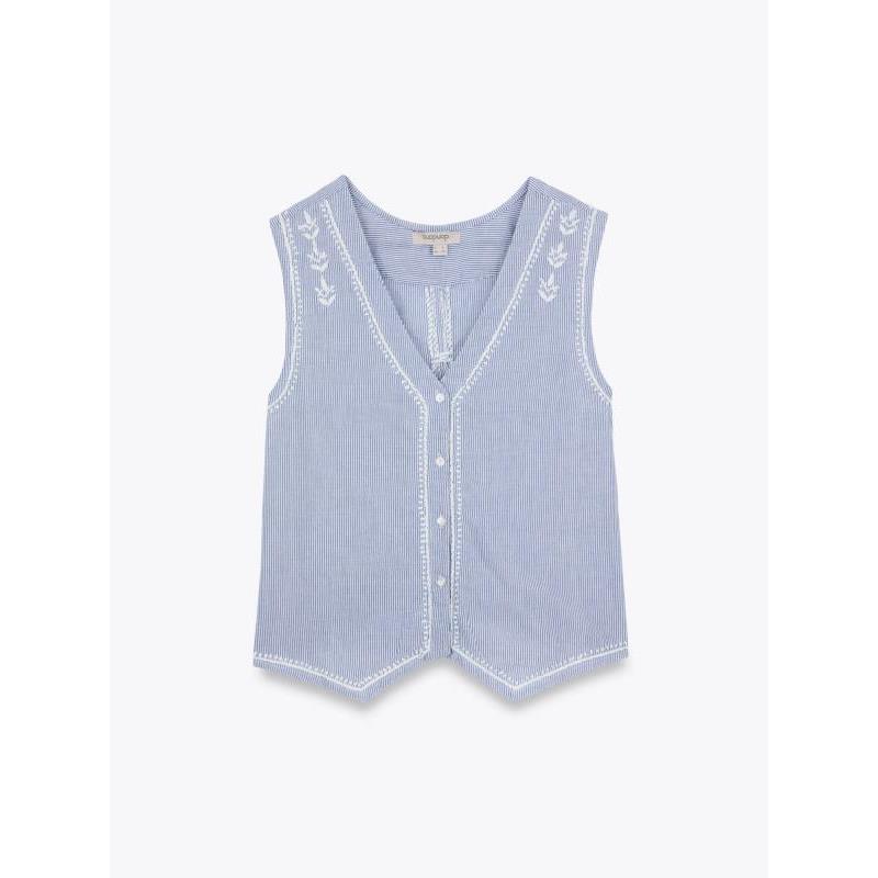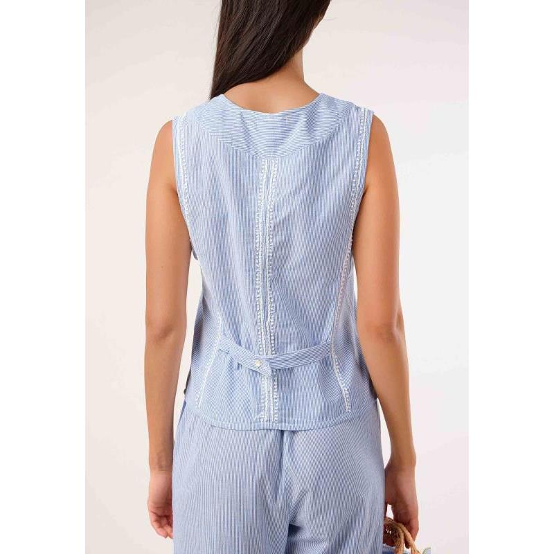 Chaleco azul a rayas con detalle de bordado en blanco. Cierre delantero mediante botones.