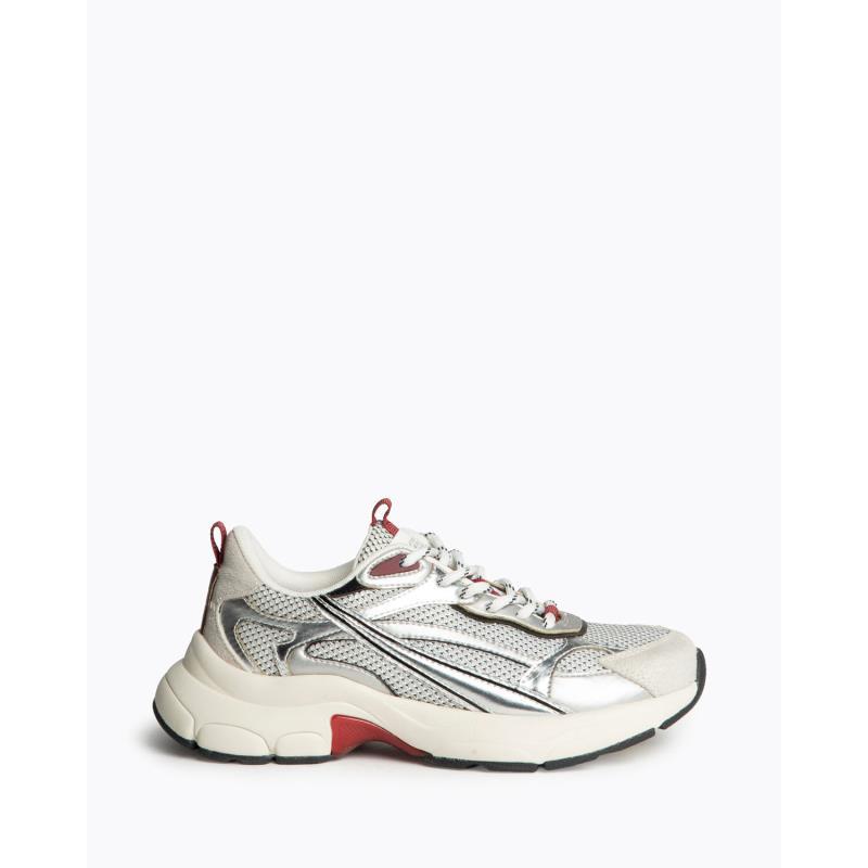 Zapatilla deportiva tipo running con detalles combinados en granate y plateado. Cierre mediante cordones.