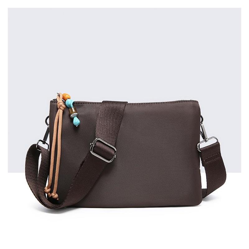 Bandolera en tejido tipo nylon con asa ajustable al tono. Cierre mediante cremallera. Detalle de piedras en el tirador.