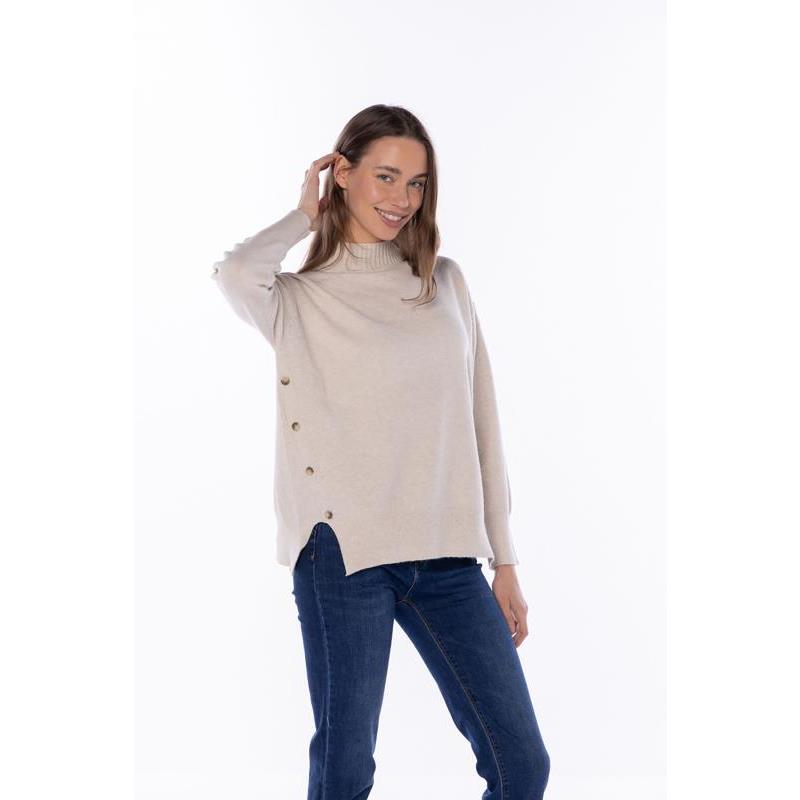 Jersey en punto con cuello semicisne en color beige. Detalle de botones y aberturas laterales.