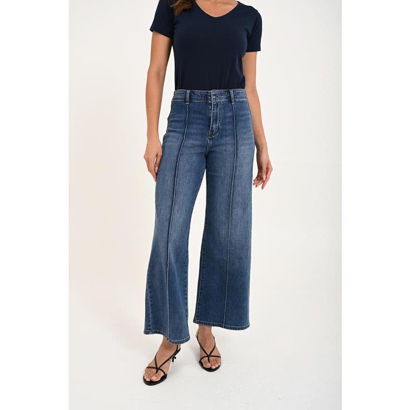 Vaquero tiro alto ancho con nervio en la parte delantera. Cierre mediante cremallera y botón.