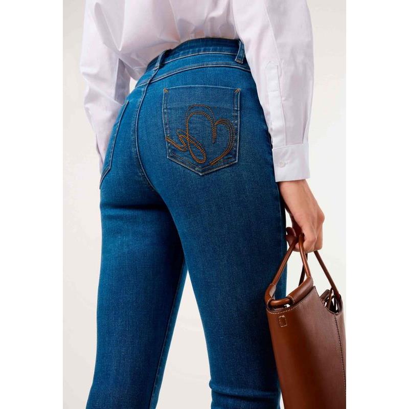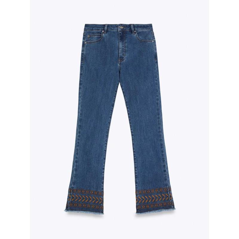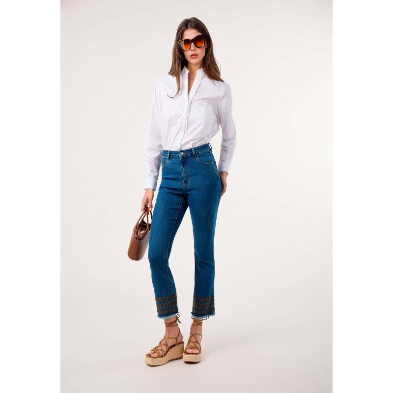 Pantalón vaquero oscuro crop con detalle de bordado en los bajos.