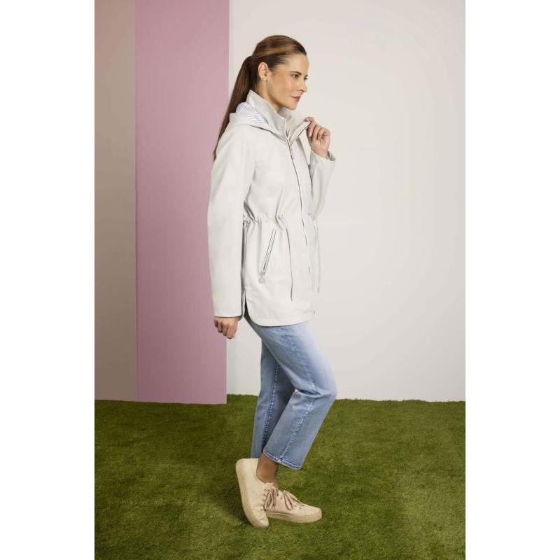 Parka de mujer engomada en gris claro con capucha y forro a contraste mil rayas. Cierre mediante cremallera. Aberturas laterales. Dos bolsillos laterales con cremallera.