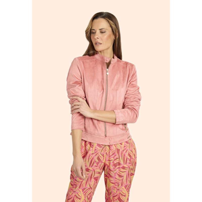 Cazadora corta en antelina en coral rosado. Cierre delantero mediante cremallera. Dos bolsillos laterales con cremallera.