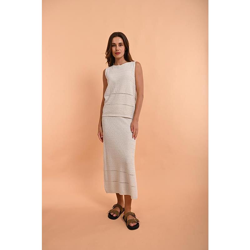 Falda midi en punto con abertura lateral.