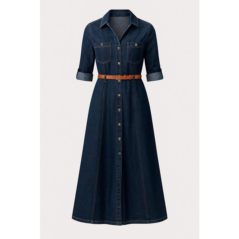 Vestido camisero en tejido denim con detalles de bolsillos delanteros. Cierre mediante botones. Cuello camisero. Bolsillos laterales.