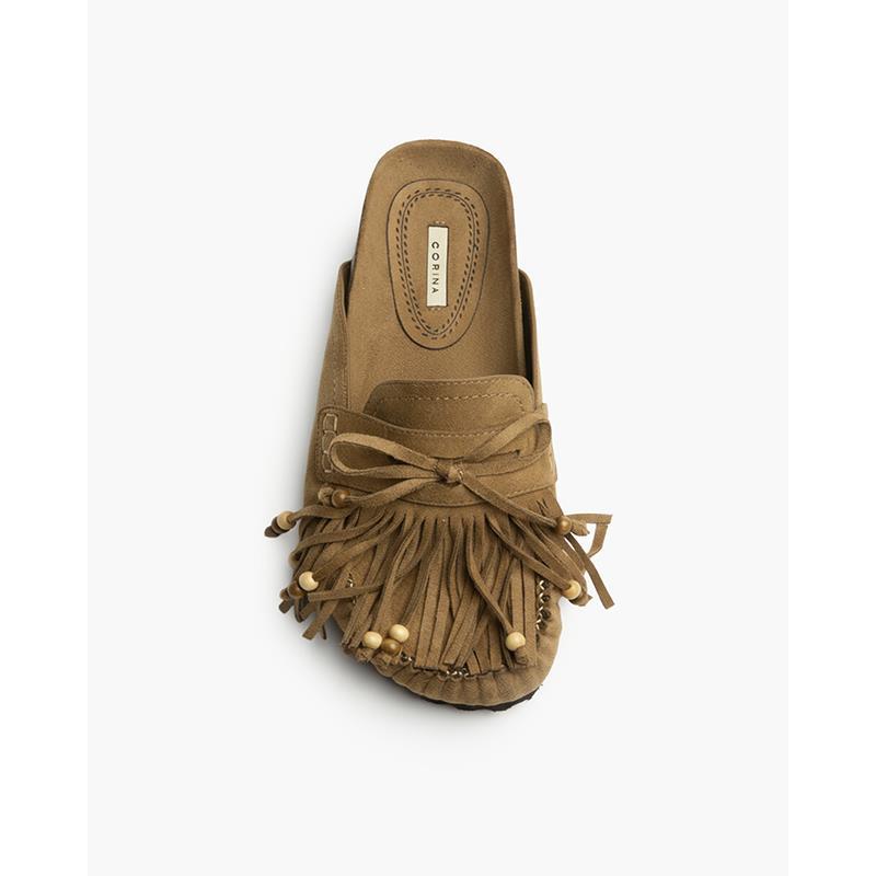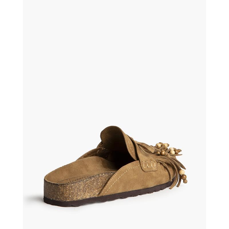 Zueco estilo boho abierto con detalle de flecos y borlas.Zueco plano estilo boho. Suela ergonómica, punta redonda. Detalle de flecos y borlas. Fruncidos en la puntera.